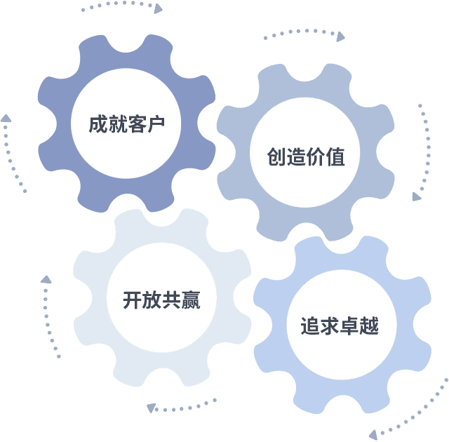成就客户是一切决策的出发点,,,,创造价值是衡量所有工作的标准,,,追求卓越是尊龙时凯做事做人的态度,,,,开放共赢是尊龙时凯的格局也是最终的结果。。。。价值观的齿轮环环相扣,,推动着组织里的每个人不断向前。。